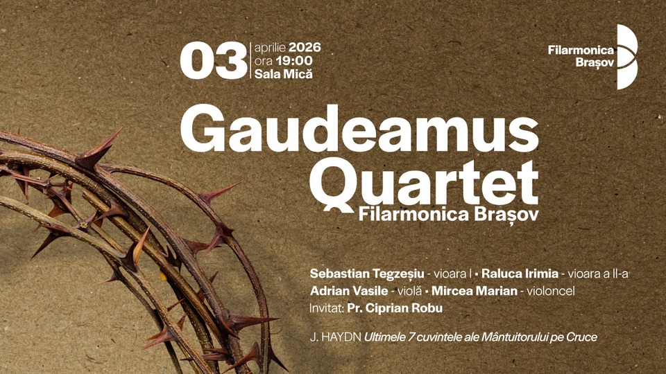 La Filarmonica din Brașov, Cvartetul "Gaudeamus" propune astăzi, 3 aprilie 2026, lucrarea "Ultimele 7 cuvinte ale Mântuitorului pe Cruce" de Joseph Haydn.