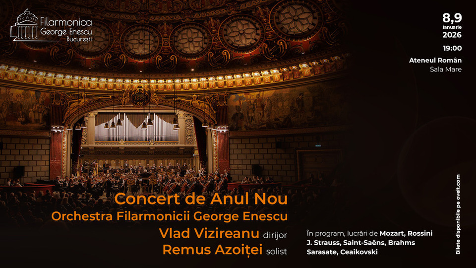 La Ateneul Român, are loc și astăzi, 9 ianuarie 2026, de la ora 19.00, un concert dedicat Anului Nou propus de Orchestra Filarmonicii „George Enescu”. Sub bagheta dirijorului Vlad Vizireanu, vor fi interpretate pagini semnate de Gioachino Rossini, Camille Saint-Saens, Wolfgang Amadeus Mozart, Johannes Brahms, Pablo Sarasate, Johann Strauss-fiul și Nikolai Rimski-Korsakov. Solistul serii este violonistul Remus Azoiței.