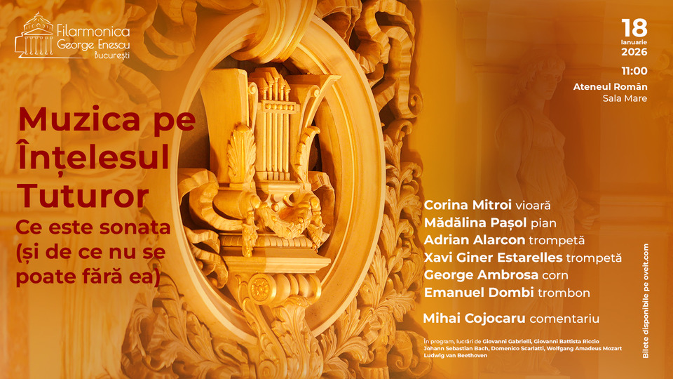 Filarmonica „George Enescu” propune astăzi, 18 ianuarie 2026, un concert educativ din seria „Muzica pe înțelesul tuturor”, intitulat „Ce este sonata (și de ce nu se poate fără ea)”.