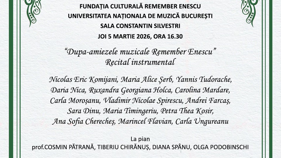 Un nou recital instrumental din seria După-amiezele muzicale "Remember Enescu" va avea loc astăzi, 5 martie 2026, începând cu ora 16.30, la Sala "Constantin Silvestri" a Universității Naționale de Muzică din București.