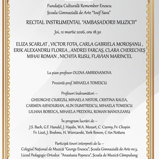 „Ambasadorii muzicii” - recital instrumental la Școala Gimnazială de Arte „Iosif Sava"Publicat: joi, 12 Martie 2026 |